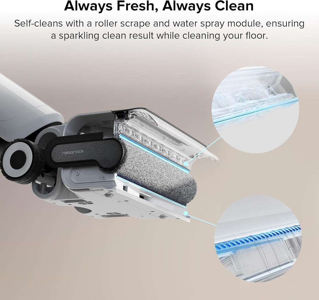 【Immer Frisch, Immer Sauber】Reinigt sich mit Rollenschaber und Wassersprühmodul selber, und zwar während er den Boden reinigt. Das Ergebnis: ein blitzsauberer Boden.