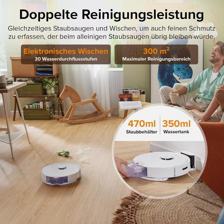Vakuum und Mopp gleichzeitig, um feinen Schmutz einzufangen, den das staub saugen allein verfehlen könnte. Und sein maximaler Vakuum bereich kann 300 qm erreichen.